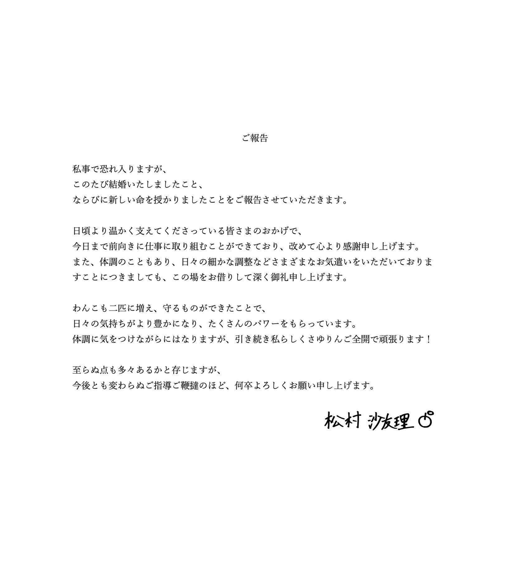 据日媒《Sponichi Annex》报导,松村沙友理率先在Instagram晒出一张穿着礼服、抱着两只爱犬的照片,并发文报喜:「有件私事向大家报告,我现在已经结婚,并且正孕育着一个新的生命。」而她的丈夫是任职于东京某家企业的年长上班族,两人交往将近两年修成正果。根据身边的人透露,男方被形容「有着橄榄球选手体型的壮硕体格,是个开朗温柔的人」。两人恋情在去年5月被《Smart FLASH》报导曝光,当时她认爱回应:「完全还不是那个阶段。现在我正处于努力工作模式,希望大家能够持续守护我。」如今则闪电宣布结婚,怀孕已经进入安定期,她也已向所属经纪公司报告这份双重喜讯。松村沙友理透过社群平台宣布结婚,而且已经怀孕。(图/翻摄自X)